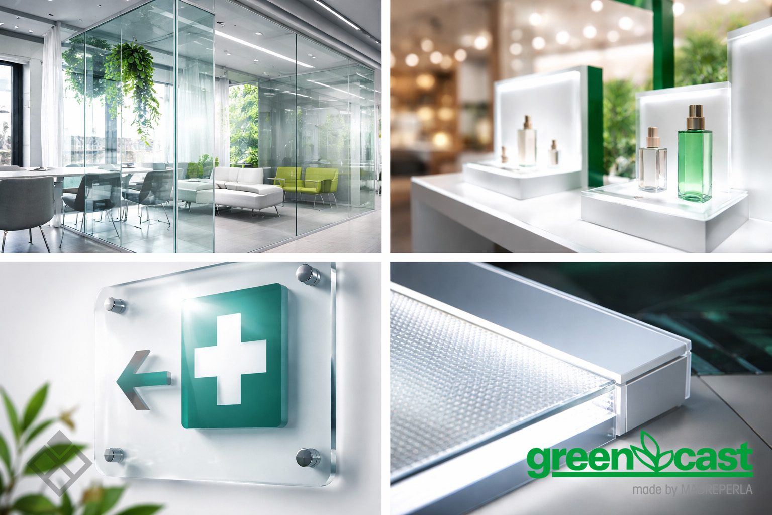 En divisiones de espacios, protecciones transparentes o elementos decorativos, GreenCast® aporta: